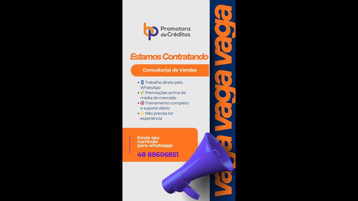 Estamos com uma vaga no setor de vendas, na área de renegociação de empréstimo consignado!